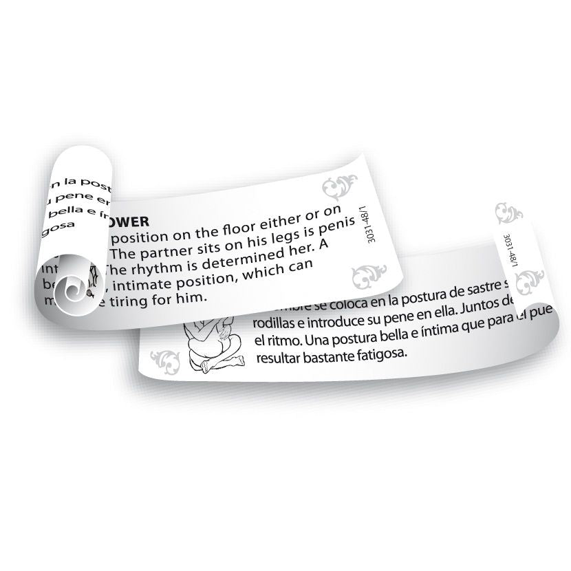 ¡Una sensación para ti y tu pareja! Usted o su pareja retiran un rollo del corazón con unas pinzas. ¿Qué posición erótica vas a hacer? ¿Es 'el columpio', 'el barco del amor' o 'la adoración'? Atrévete a desafiarte juntos y experimentar el placer y la intimidad juntos.